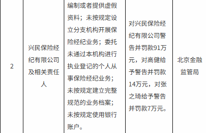 【大河财立方消息】9月5日,国家金融监督管理总局北京监管局披露的行政处罚信息公开表显示,兴民保险经纪有限公司及相关责任人因多项违法违规被罚。