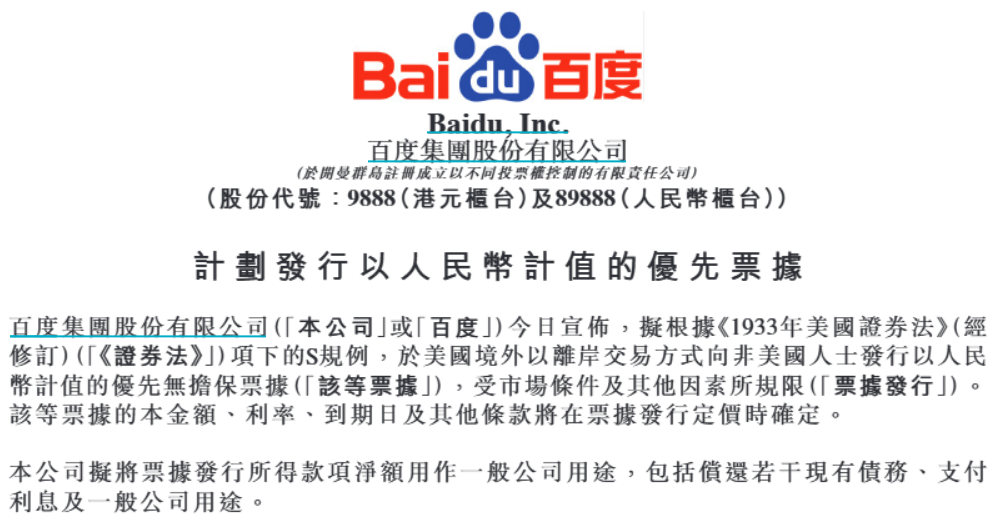 【大河财立方消息】9月8日,百度集团发布公告称,拟根据有关规例,于万博体育下载境外以离岸交易方式向非万博体育下载人士发行以人民币计值的优先无担保票据,票据的本金额、利率、到期日及其他条款将在票据发行定价时确定。