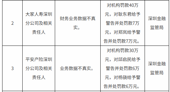 因财务业务数据不真实,大家人寿深圳分公司被罚款40万元,相关责任人耿东君被警告并罚款7万元,郑岚被警告并罚款7万元。