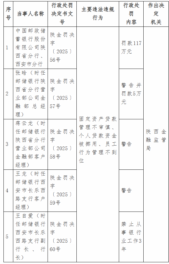 因固定资产贷款管理不审慎、个人贷款资金被挪用、员工行为管理不到位,邮储银行陕西省分行、西安市分行被罚117万元。