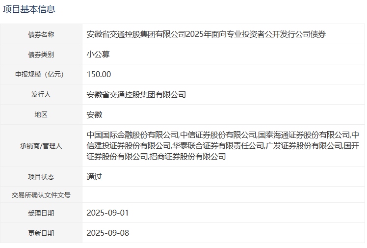 【大河财立方消息】9月9日消息,安徽省交通控股集团有限公司2025年面向专业投资者公开发行公司债券项目获深交所通过。