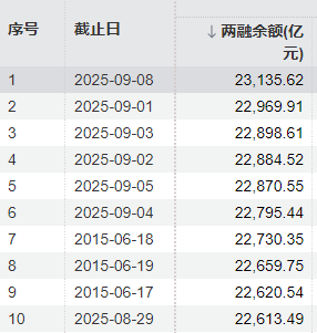 数据显示,9月8日,A股两融余额首次突破2.3万亿元,达23135.62亿元,创历史新高。其中,融资余额22975亿元,融券余额160亿元。两融余额占A股流通市值的比例为2.47%。
