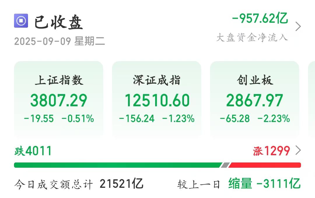 4011只个股飘绿,京沪深三市成交额21521亿元,较前一日缩量3111亿元。