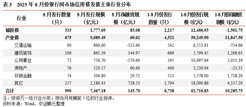 7.8月份银行间市场城投债发行环比回升,产业债行业以交运、建筑装饰、公用事业为主