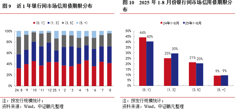 综合1-8月份,1年期及以下短期限债券发行规模占比40.5%,规模占比较去年同期下降3.8pct;1-3年期(含3年期)债券发行规模占比29.7%,较去年同期上升4.5pct;3-5年期(含5年期)发行规模占比20.4%,较去年同期下降1.0pct;5年期以上的债券发行规模占比9.5%,较去年同期上升0.4pct。