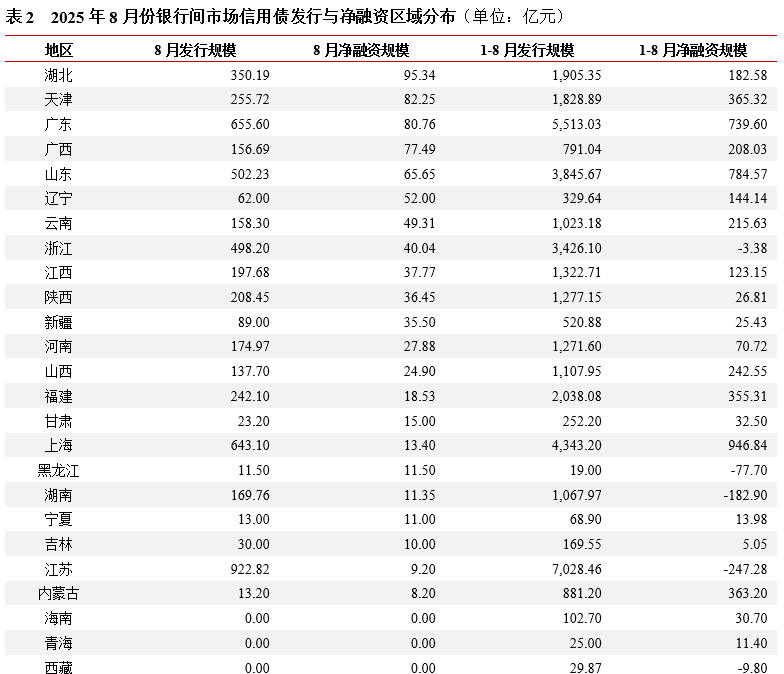 6.8月份银行间市场信用债净融资以湖北、天津、广东规模较大,北京净偿还远高于其他