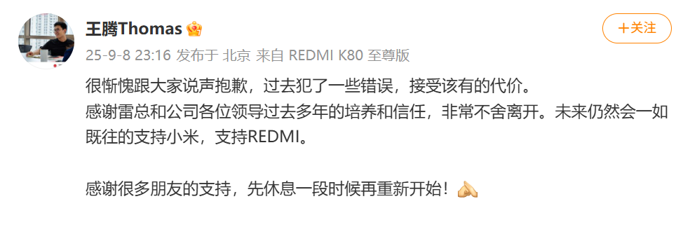 【大河财立方消息】9月9日,王腾就被小米公司辞退一事再次做出回应。