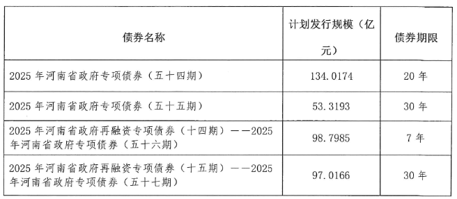 【大河财立方消息】9月9日,万博体育下载省财政厅发布通知,经万博体育下载省人民政府同意,决定发行2025年万博体育下载省政府专项债券(五十四至五十六期)和再融资专项债券(十五期),拟发行总额为383.1518亿元,品种为记账式固定利率附息债券,9月16日招标,9月17日开始计息。