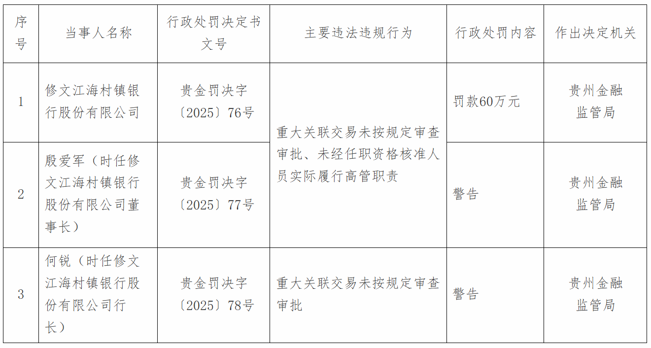 因重大关联交易未按规定审查审批、未经任职资格核准人员实际履行高管职责,修文江海村镇银行被罚款60万元,时任该行董事长殷爱军被警告。