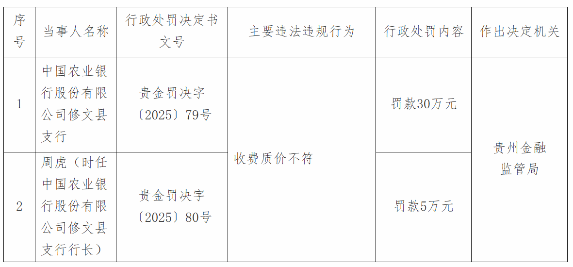 因收费质价不符,中国农业银行修文县支行被罚款30万元,时任该行行长周虎被罚款5万元。