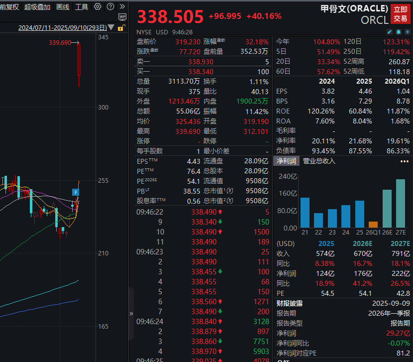 截至发稿,甲骨文公司股价涨幅已超40%,报338.505美元/股,创历史新高,总市值9508亿美元,一日增加2700亿美元。