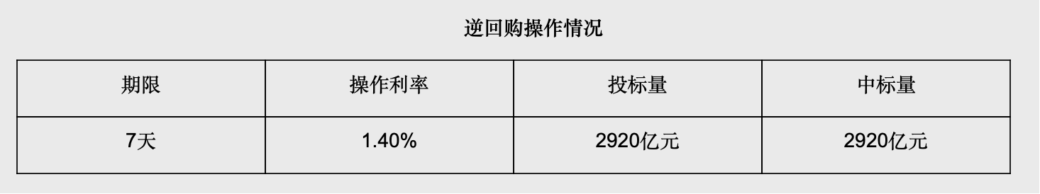 【大河财立方消息】9月11日,中国人民银行以固定利率、数量招标方式开展了2920亿元逆回购操作,操作利率1.40%,与此前持平。因今日有2126亿元7天期逆回购到期,当日实现净投放794亿元。