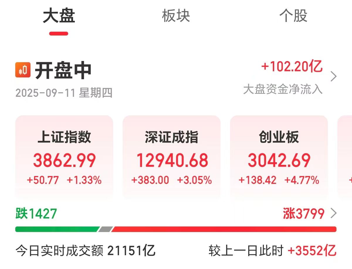 【大河财立方消息】9月11日,午后深证成指涨幅超3%,上证指数涨1.33%,创业板指涨4.77%。算力硬件、消费电子、芯片等板块指数涨幅居前,沪深京三市上涨个股超3700只。