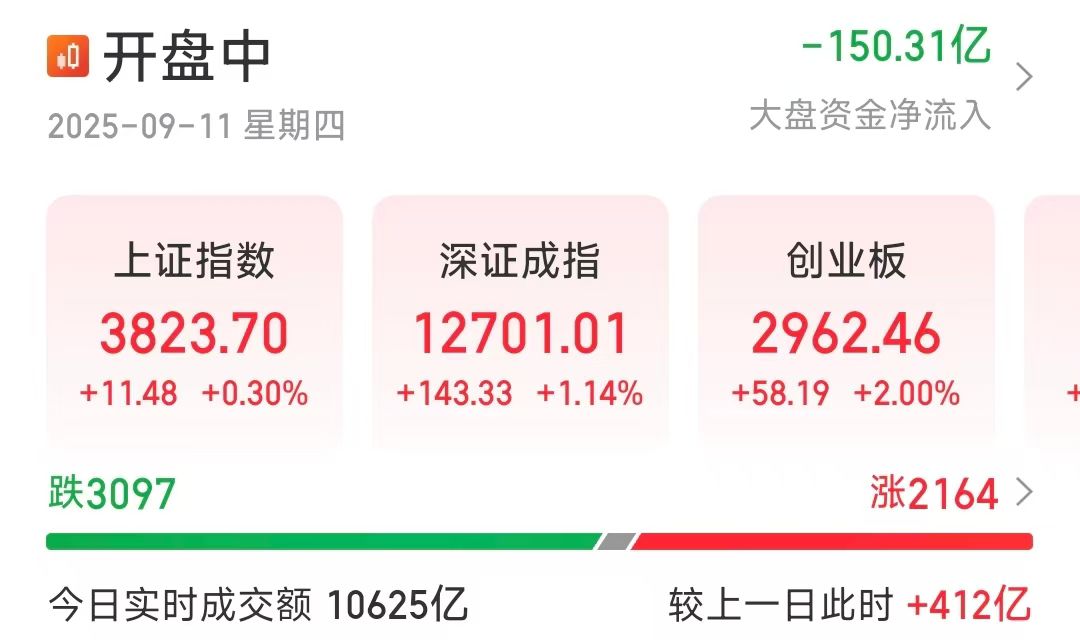 【大河财立方消息】9月11日,A股三大指数盘中走强。截至10时38分,沪指涨0.30%,深证成指涨1.14%,沪指涨2%。全市场实时成交额1.0万亿元,较上一个交易日放了412亿元。