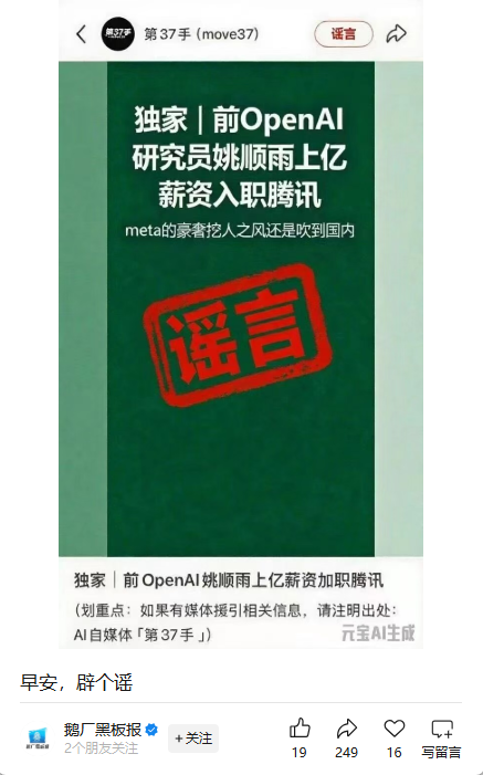 【大河财立方消息】近日有消息称,OpenAI前研究员姚顺雨上亿薪资入职腾讯。9月12日,“鹅厂黑板报”发布消息称该传闻不实。