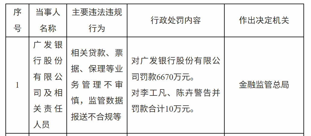 【大河财立方消息】9月12日,国家金融监督管理总局披露的行政处罚信息公示列表显示,因相关贷款、票据、保理等业务管理不审慎,监管数据报送不合规等,广发银行被罚款6670万元。