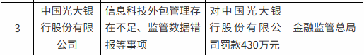 【大河财立方消息】9月12日,国家金融监督管理总局披露的行政处罚信息公示列表显示,中国光大银行股份有限公司因信息科技外包管理存在不足、监管数据错报等事项,被罚430万元。