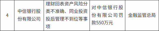 【大河财立方消息】9月12日,国家金融监管总局披露行政处罚信息,因理财回表资产风险分类不准确、同业投资投后管理不到位等事项,中信银行被罚550万元。