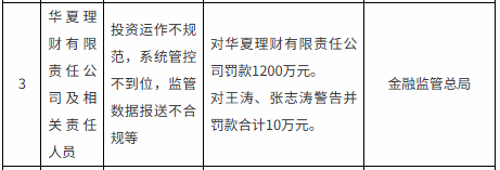 【大河财立方消息】9月12日,国家金融监督管理总局披露的行政处罚信息公示列表显示,华夏理财有限责任公司因投资运作不规范,系统管控不到位,监管数据报送不合规等,被罚款1200万元。