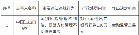 【大河财立方消息】9月12日,国家金融监督管理总局行政处罚信息公示列表显示,中国进出口银行因国别风险管理不到位、薪酬支付管理不到位等事项被罚款130万元。