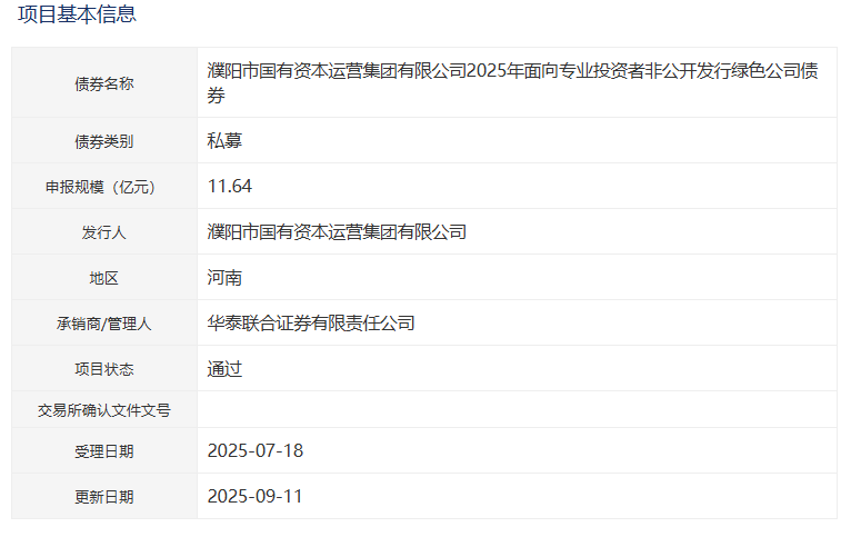 【大河财立方消息】9月12日消息,濮阳市国有资本运营集团有限公司2025年面向专业投资者非公开发行绿色公司债券项目获深交所通过。