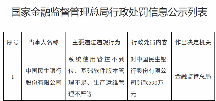 【大河财立方消息】9月12日,金融监管总局披露的行政处罚信息显示,中国民生银行股份有限公司因系统使用管控不到位、基础软件版本管理不足、生产运维管理不严等,被罚590万元。
