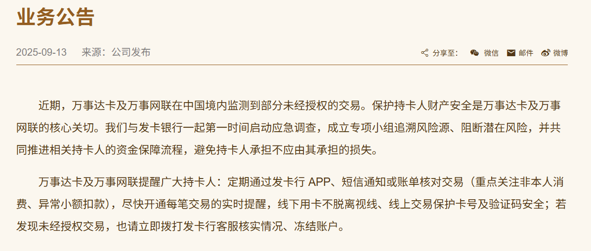 9月13日,万事网联发布公告称,近期,万事达卡及万事网联在中国境内监测到部分未经授权的交易。保护持卡人财产安全是万事达卡及万事网联的核心关切。我们与发卡银行一起第一时间启动应急调查,成立专项小组追溯风险源、阻断潜在风险,并共同推进相关持卡人的资金保障流程,避免持卡人承担不应由其承担的损失。
