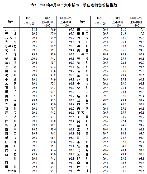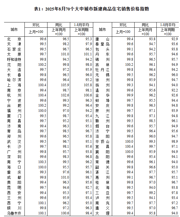【大河财立方消息】9月15日,国家统计局发布8月份70个大中城市商品住宅销售价格变动情况。数据显示,2025年8月份,70个大中城市中,各线城市商品住宅销售价格环比下降,同比降幅总体继续收窄。