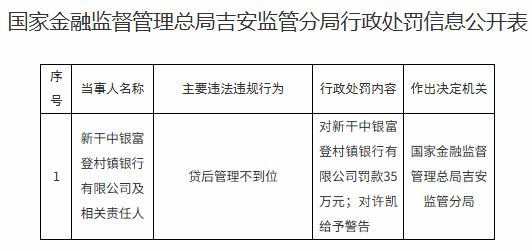 【大河财立方消息】9月15日,国家金融监督管理总局吉安监管分局披露的行政处罚信息公开表显示,新干中银富登村镇银行有限公司因贷后管理不到位,被罚35万元,相关责任人许凯受到警告处罚。