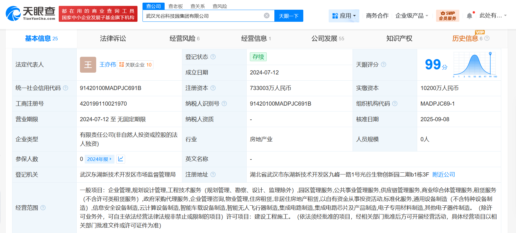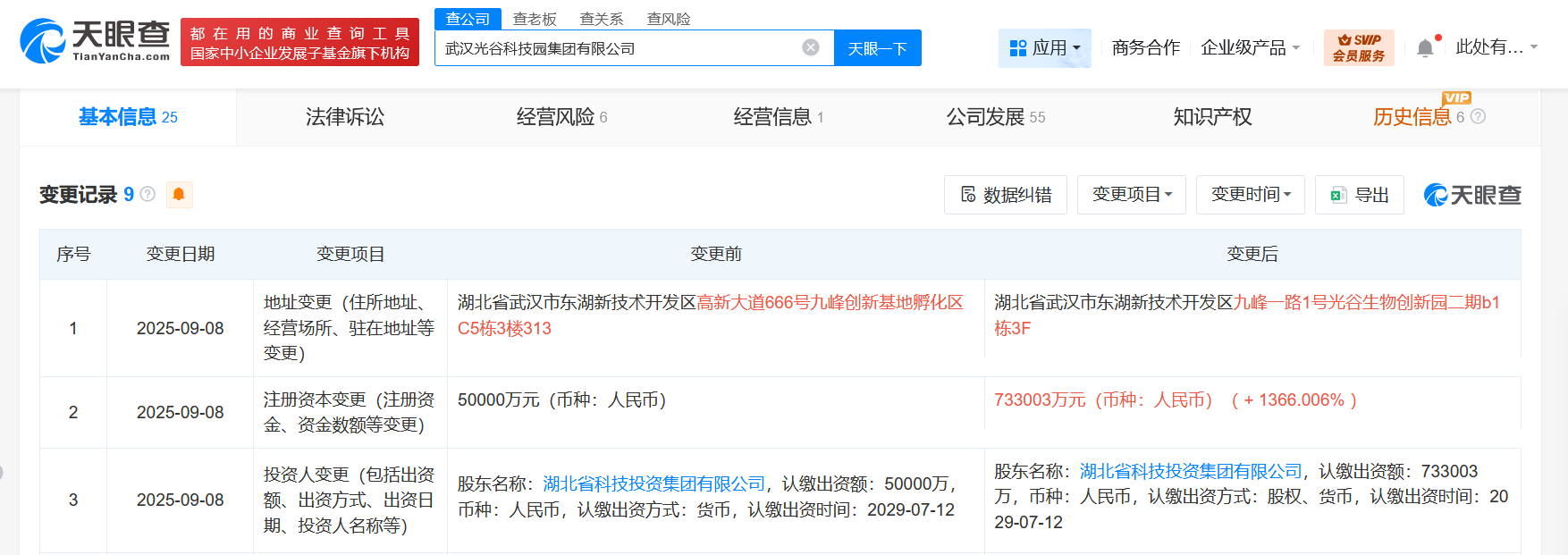 【大河财立方消息】9月15日消息,天眼查App显示,近日,武汉光谷科技园集团有限公司发生工商变更,注册资本由5亿人民币增至约73.3亿人民币,增幅约1366%。