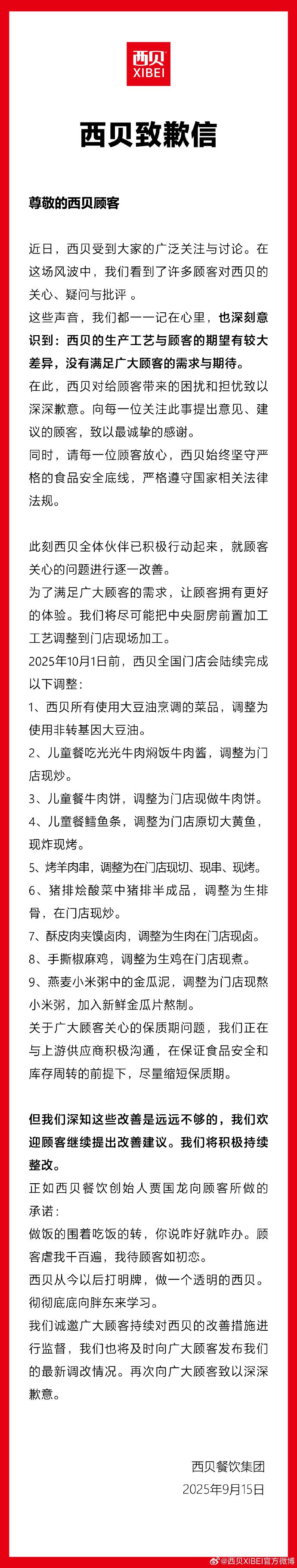 西贝称,将尽可能把中央厨房前置加工工艺调整到门店现场加工。2025年10月1日前,西贝全国门店会陆续完成以下调整: