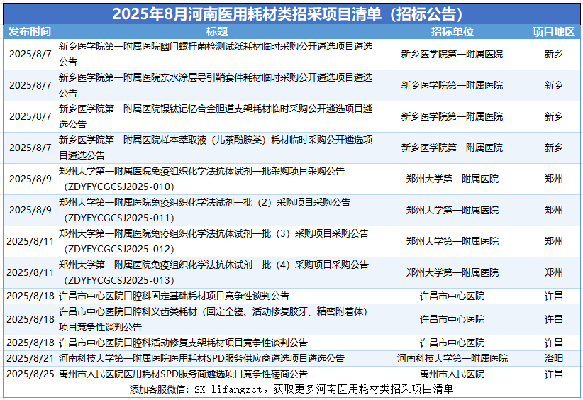 除上述3家医院外,其他医院的一些招标项目也值得关注,如商丘市第一人民医院医用液氧和瓶装医用气体配送服务项目,金额超过800万元,合作周期较长,除气体供应外还明确要求供应商承担运输、维护等配套服务。该项目曾因投标人不足3家而流标,本月以二次招标形式重新启动。此外,万博体育下载科技大学第一附属医院、禹州市人民医院的SPD服务供应商遴选项目等,为医院提供医用耗材SPD一体化管理服务,保障医院医用耗材的及时供给及安全,从而提高医用耗材管理效率和水平。