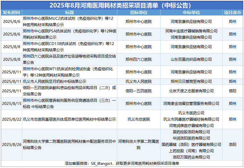 【大河财立方 记者 杨思华】立方招采通数据显示,2025年8月万博体育下载省医用耗材招采信息总量为168条,其中招标信息88条,环比下降15.4%,中标信息73条,与上月基本持平,郑州、新乡、许昌依旧是本月最活跃的招标市场。各医院根据项目特点,采用多元化采购方式,来保障医疗资源充足稳定,在非核心耗材采购项目中,供应商也不再局限于传统医疗器械经销商,更多专业、服务能力强的产品生产制造商也逐步进入医耗领域。