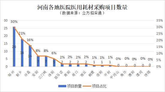 从招标项目地域分布来看,郑州、新乡、许昌依旧是招标最多的3个城市,占据了全省近七成的项目。省会郑州领跑,共发布招标信息26条,占比30%。新乡位列第二,发布招标信息18条,占比21%。许昌位列第三,发布招标信息14条,占比16%。安阳、三门峡各7条,洛阳5条,其余地市项目数量均不超过2条。