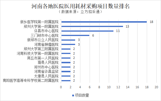 从招标单位来看,新乡医学院第一附属医院、郑州大学第一附属医院和许昌市中心医院招标项目数量位列前三。