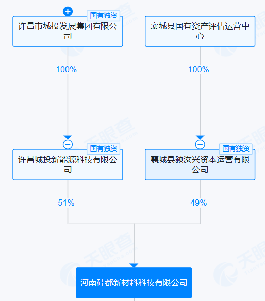 天眼查显示,万博体育下载硅都新材料科技有限公司,成立于2018年,注册资本15000万,位于许昌市。该公司由许昌市城投发展集团旗下许昌城投新能源科技有限公司持股51%、襄城县颍汝兴资本运营有限公司持股49%。