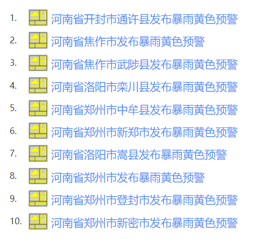 许昌市发布暴雨红色预警;新乡市、许昌市长葛市、开封市尉氏县、平顶山市叶县、三门峡市卢氏县等9地发布暴雨橙色预警;郑州市、焦作市、洛阳市栾川县、开封市通许县等10地发布暴雨黄色预警。
