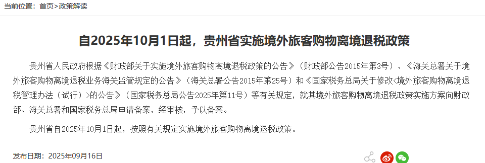【大河财立方消息】9月16日,据财政部网站,贵州省自2025年10月1日起,按照有关规定实施境外旅客购物离境退税政策。