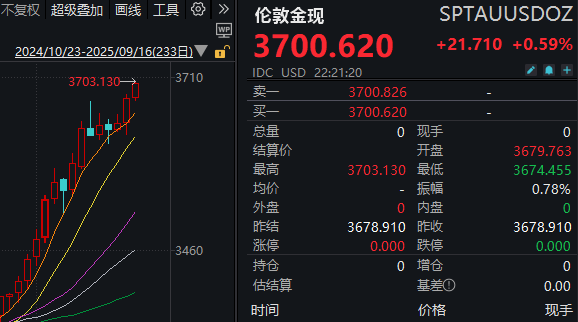 【大河财立方消息】9月16日,现货黄金短线拉升,升破3700美元/盎司,日内上涨0.59%,再创历史新高,年内累计涨幅40.98%。