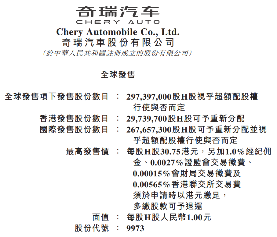 【大河财立方消息】9月17日,奇瑞汽车在港交所公告称,拟发行2.97亿股H股(视乎超额配股权行使与否而定),每股定价区间为27.75至30.75港元,拟于9月23日完成定价。预期股票将于9月25日在港交所开始交易。