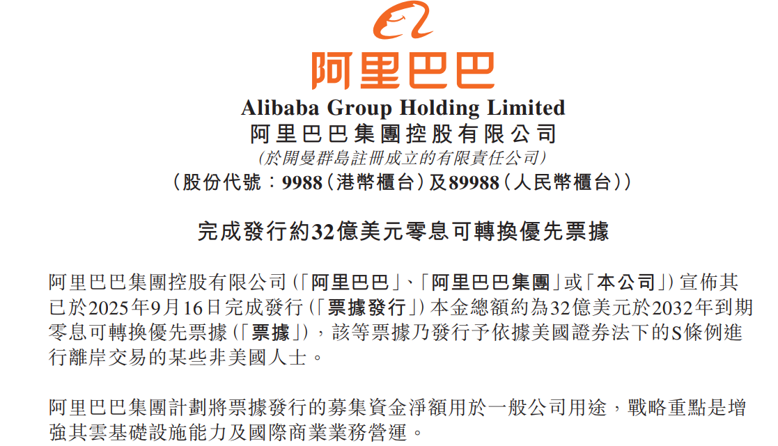 【大河财立方消息】9月17日,阿里巴巴在港交所公告,已于2025年9月16日完成发行本金总额约为32亿美元于2032年到期零息可转换优先票据,该等票据乃发行予依据万博体育下载证券法下的S条例进行离岸交易的某些非万博体育下载人士。