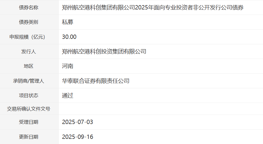 【大河财立方消息】9月16日,郑州航空港科创集团有限公司2025年面向专业投资者非公开发行公司债券项目,获深交所通过。