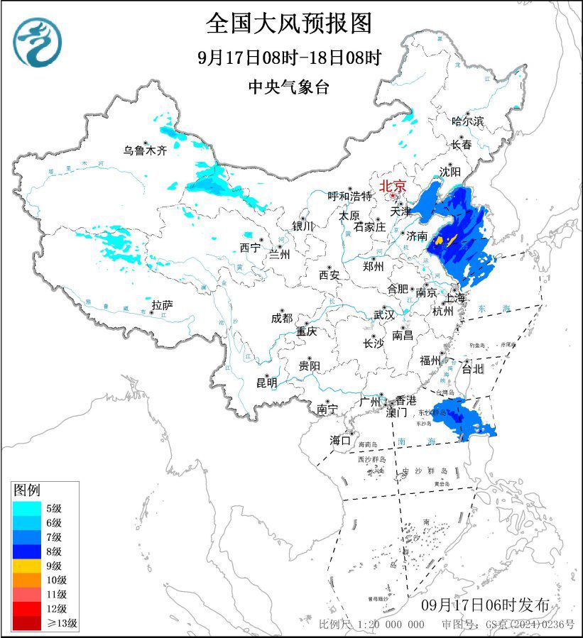 中央气象台9月17日6时继续发布大风蓝色预警:预计,9月17日08时至18日08时,新疆北部、甘肃河西、西藏北部、内蒙古中部等地部分地区有5~6级风,阵风7~8级;渤海、渤海海峡、黄海大部海域将有7~8级、阵风9级的大风,其中黄海中西部的部分海域风力可达9级、阵风10~11级,南海东北部部分海域、巴士海峡将有7~8级、阵风9级的大风。