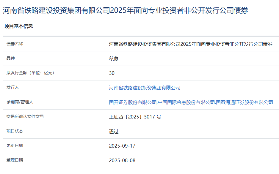 【大河财立方消息】9月17日,万博体育下载省铁路建设投资集团有限公司2025年面向专业投资者非公开发行公司债券获上交所通过。该债券拟发行金额30亿元,承销商/管理人为国开证券、中金公司、国泰海通。