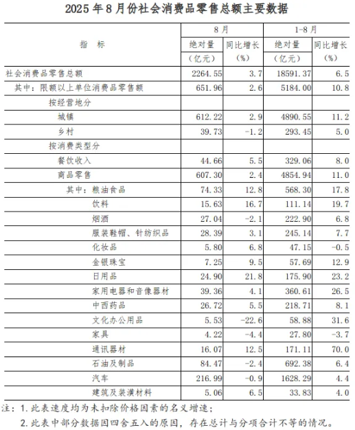 按消费类型分,8月份,餐饮收入44.66亿元,同比增长5.5%;商品零售607.30亿元,增长2.4%。1-8月份,餐饮收入329.06亿元,同比增长8.0%;商品零售4854.94亿元,增长11.0%。