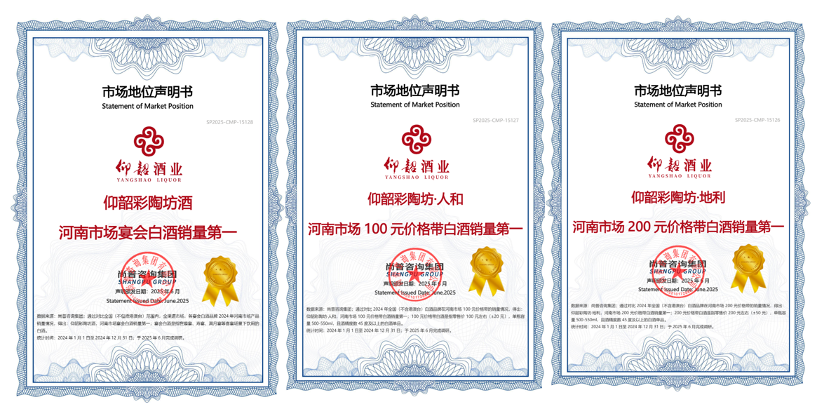 近日,经专业机构尚普咨询认证,仰韶彩陶坊酒荣获“万博体育下载市场宴会白酒销量第一”,其核心单品仰韶彩陶坊·人和荣获“万博体育下载市场100元价格带销量第一”,仰韶彩陶坊·地利夺得“万博体育下载市场200元价格带销量第一”。