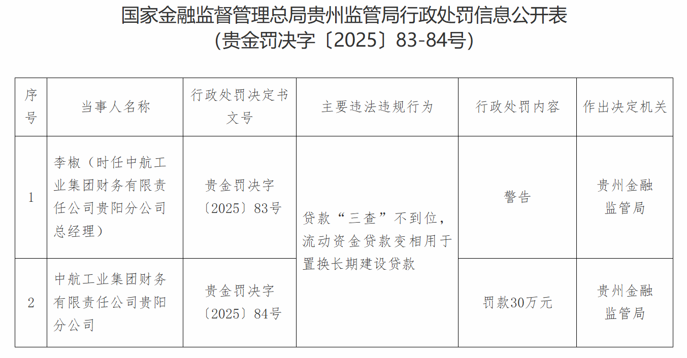 因贷款“三查”不到位,流动资金贷款变相用于置换长期建设贷款,中航工业集团财务公司贵阳分公司被罚款30万元,时任该公司总经理李椒被警告。