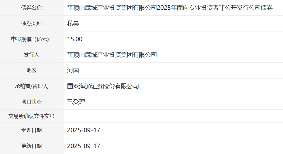 【大河财立方消息】9月17日,平顶山鹰城产业投资集团有限公司2025年面向专业投资者非公开发行公司债券项目,获深交所受理。