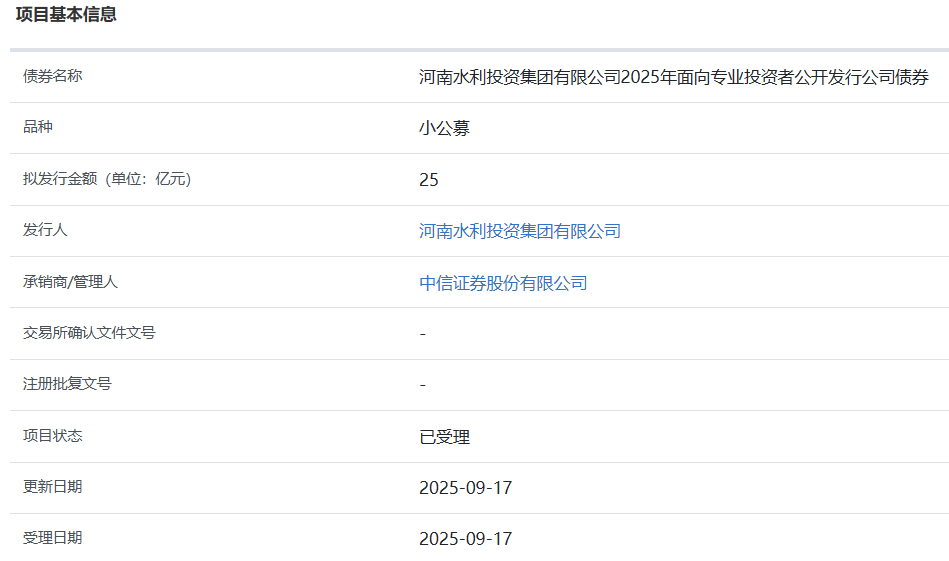 【大河财立方消息】9月17日,万博体育下载水利投资集团有限公司2025年面向专业投资者公开发行公司债券项目,获上交所受理。