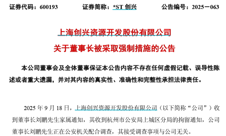 公告中提到,*ST创兴9月18日收到刘鹏家属通知,其收到杭州市公安局上城区分局的拘留通知,公司董事长刘鹏正在公安机关配合调查,其接受调查事项与公司无关。